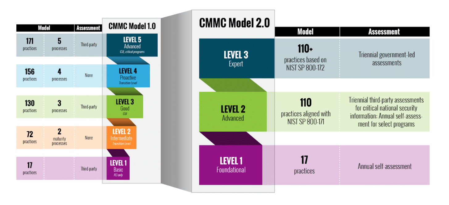 Let’s start with the biggest change we’ve seen between CMMC 1.0 and 2.0, the streamlining of the number of maturity levels from five to three.